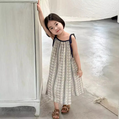 Girls Casual Dresses Summer New Korea Childrens Clothing Korean 2024 Lovely Fragmented Flowers Loose Fashion Striped