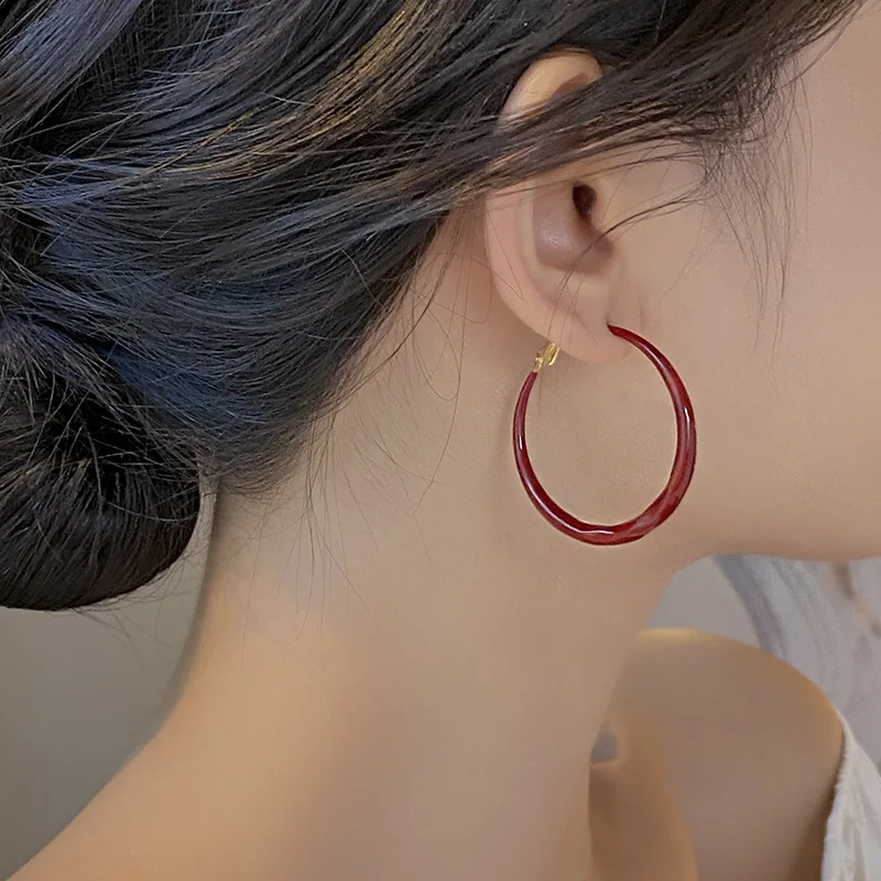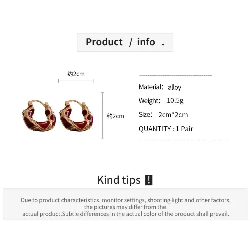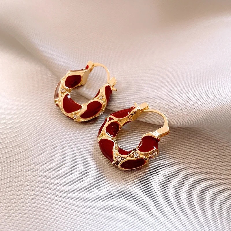 Hoop earrings featuring vintage red spot design and U-shaped round dripping oil style. Elegant accessory for any outfit.