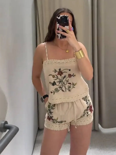 Lace Embroidered Halter Top Shorts Set Vacation Beach Vintage Women Camisole Short Blouse Cotton Linen Slimming Vest Suspender